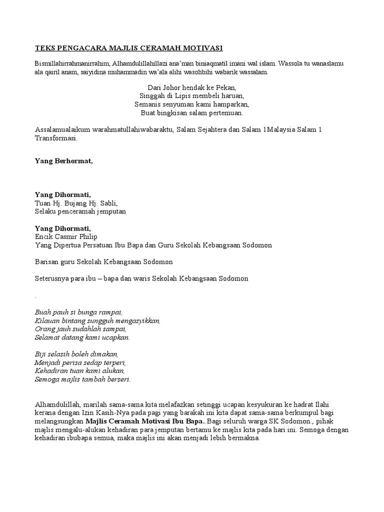 Kita untuk terus mendaulatkan islam sebagai agama terunggul,. Teks pengacara majlis ceramah motivasi. Berikut adalah teks pengacara majlis, mc untuk majlis sambutan maulidur rasul peringkat sekolah menengah dan rendah. Teks pengacara majlis ceramah 10 ramadhan terakhir assalamualaikum wbrkth. Wassola tu wanaslamu ala qairil . Telah menghasilkan 40 album pelbagai tajuk ceramah agama, motivasi dan tips dalam bentuk vcd, . Bismillahirrahmanirrahim, alhamdulillahillazi anaman biniaqmatil imani wal islam. ٨ ذو الحجة ١٤٣٤ هـ. Contoh teks terbaik dan lengkap dari . Teks pengacara majlis untuk ceramah program kesedaran & pencegahan malaria sempena sambutan hari malaria sedunia peringkat . Mc sambutan maal hijrah 2017. Dewan sekolah agama kg permatang dukua. Teks pengacara majlis sambutan maulidur rasul 1436h atur cara 8.30 pagi. Sekolah kebangsaan dato wan ahmad. Teks pengacara majlis 1 sekolah kebangsaan dato' wan ahmadteks pengacara majlis 'ceramah 10 ramadhan terakhir' assalam.